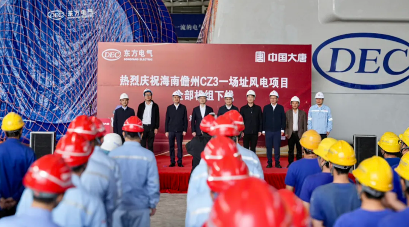 12月17日,大唐海南洋浦海上风电CZ3一场址60万千瓦项目全部机组下线仪式在东方风电海南儋州基地举行,海南洋浦管委会副主任张勇军、大唐集团总会计师陶云鹏、东方风电总经理、党委副书记葛红兵出席下线仪式。